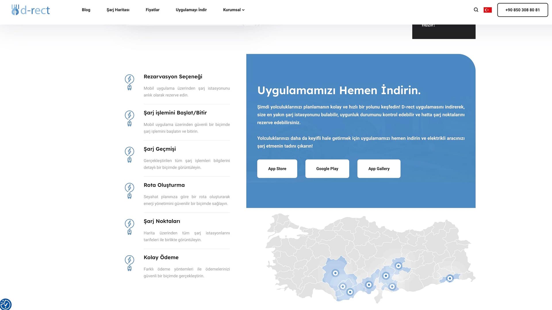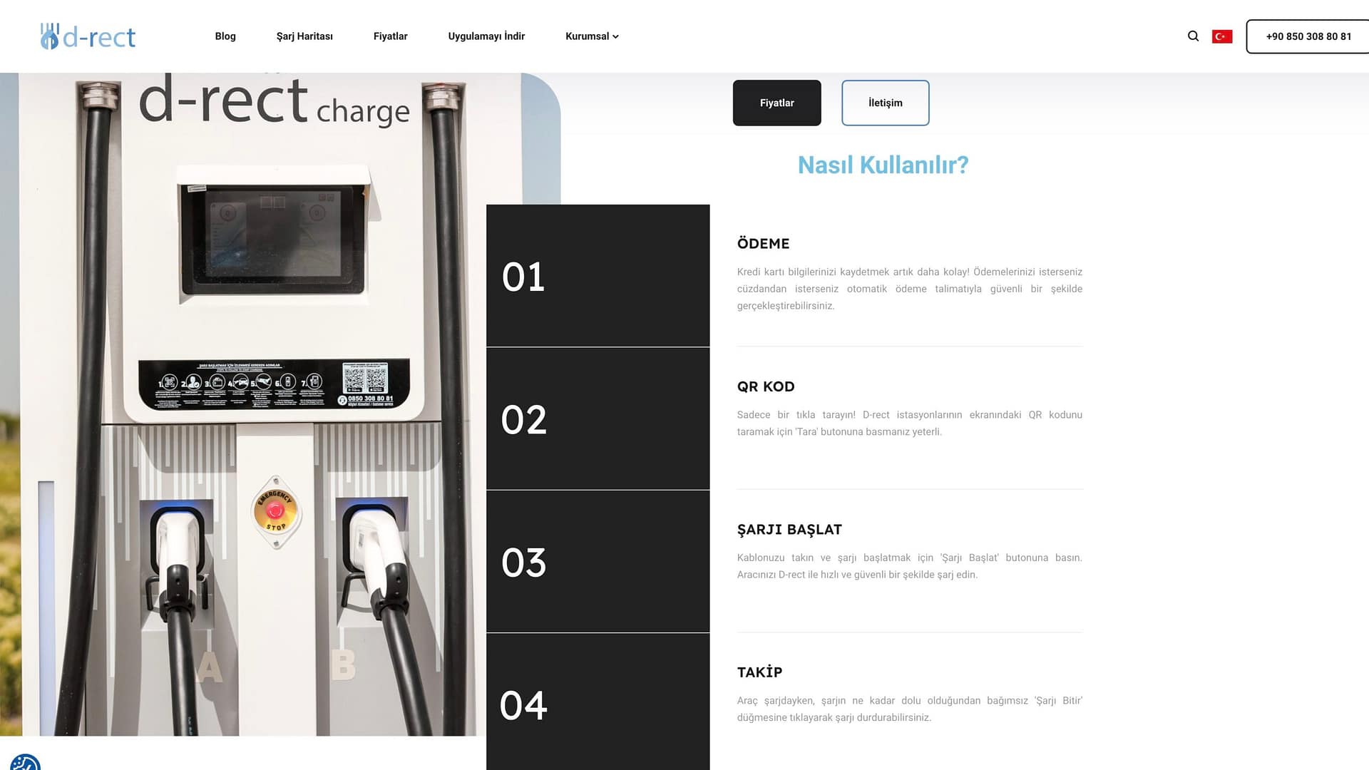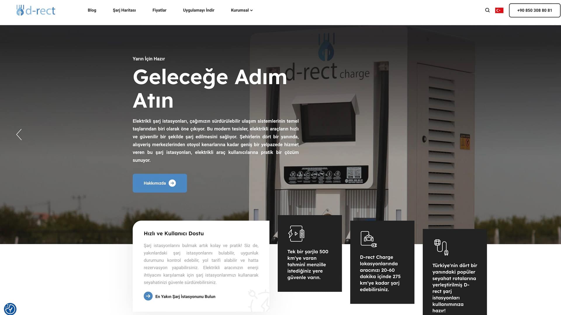Y&C ekibi, D-rect Charge için kapsamlı bir web sitesi tasarım ve geliştirme süreci gerçekleştirdi. İlk olarak, mevcut web sitelerinin eksikliklerini tespit edip, modern, kullanıcı dostu ve SEO uyumlu yeni bir web sitesi tasarladı. Web sitesini iki dilde hazırlayarak, farklı dil konuşan kullanıcılar için siteyi daha erişilebilir bir hale getirdi. Ayrıca, mobil uygulamalarındaki araç şarj istasyonlarını web sitesine entegre ederek, kullanıcı deneyimini daha da iyileştirdi.