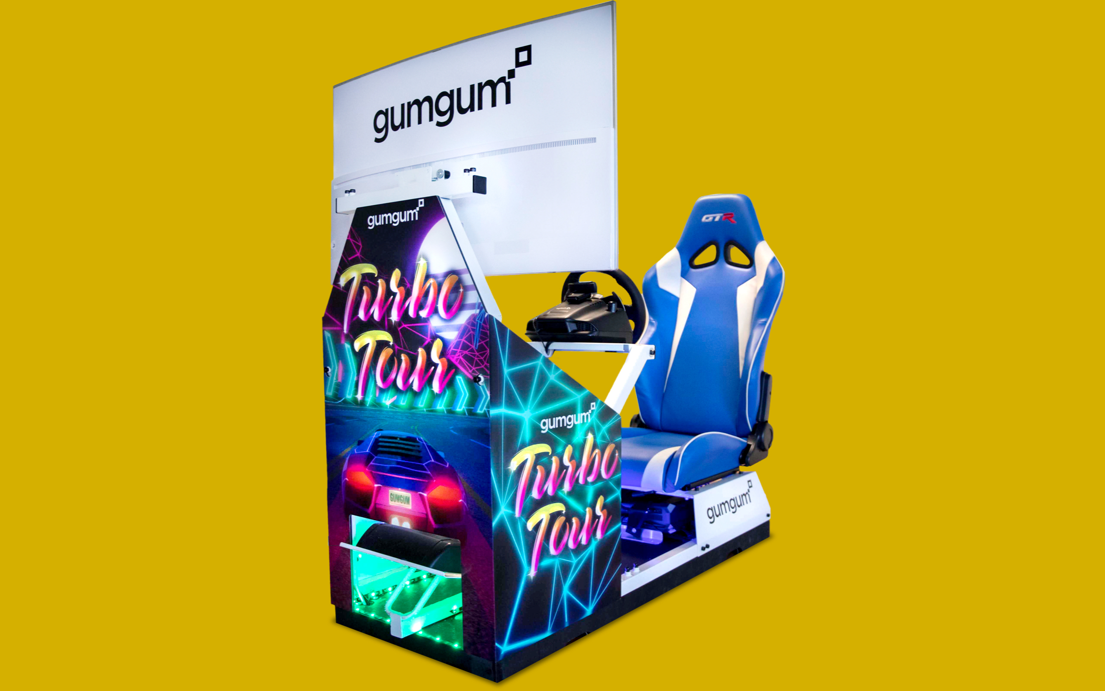 We built the Turbo Tour arcade game from scratch, as well as the physical driving rig that brought this experience to life. Players sit behind the wheel of the arcade cabinet, racing through a series of unique levels. Each level is themed around a specific GumGum marketing pillar, and educates throughout gameplay.